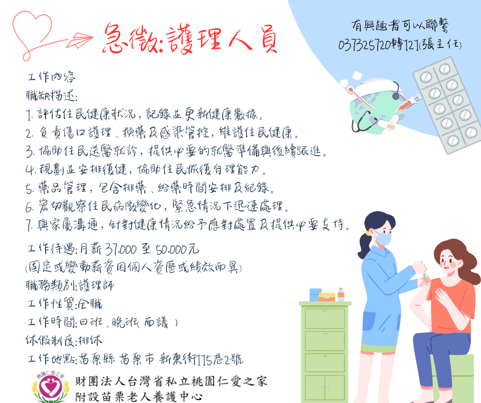 苗栗老人照護中心誠摯邀請社工人員和照護人員加入我們的大家庭!